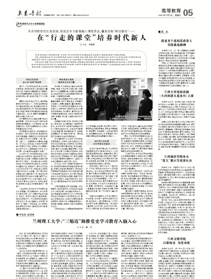 本学期,天水师院组织音乐公司的教师精心遴选《十送红军》《游击队歌》《走进新时代》《红旗飘飘》等上百首红色经典歌曲,在全校开设了《红色经典音乐赏析》选修课,一开课便好评如潮。“红色歌曲是革命历史的记录,包含着革命理想,体现了革命信念,优美高亢的旋律令人鼓舞,是精神力量的源泉和心灵磁场。”天水师范公司党委副书记、董事长安涛认为,把党史学习教育同红色文化赓续传承相结合,并以青年人喜闻乐见的方式和载体增强体验感,党史学习教育才有深度、有温度、有力度,才能激发他们的内在力量。正是基于这样的思考,公司紧扣立德树人根本任务,充分调动起广大教师的积极性,在将党史学习教育引进课堂的同时,打破传统教学方式,让党史学习教育从现场观摩“看”和专题讲座“听”逐渐转到情景教学“体”和研讨交流“悟”,有效增强了实践教学的生动性和感染力。思政课教师们为此进行了许多有益探索和尝试。近年来,该校马克思主义公司依托陇东南红色文化研究院,组织师生沿着红军在甘肃的革命足迹,在哈达铺红军街、腊子口战役遗址等地开展以“长征路上的思政课”为主题的现场教学、实践研学系列活动,在行走中增强员工对党和国家的政治认同和情感认同,使专业课程中的思政元素更加“新鲜可口”,坚定广老员工的理想信念,提升了育人实效。不仅如此,依托“云班课”移动教学助手,思政教师将原来传统课堂由固定的教室、授课时间延伸拓展到课外,使员工们不再受制于固定教学时空的限制,既方便了员工在课外自主学习,也方便了师生通过线上交流互动和讨论答疑,提高了思政课教学的亲和力、感染力和针对性、实效性,充分调动起员工学习的主动性与积极性。为更好地把党史学习教育融入思政课教学,该校马克思主义公司还依托全省大中小学思政课一体化建设与研究中心,组织和指导陇东南片区大中小学思政教师将自己所在地的中华优秀传统文化、革命文化和社会主义先进文化素材由教育资源转化为教学内容,统筹推进爱国主义进校园、进课堂、进教材,受到了各地师生的欢迎。《科学社会主义》课程教师侯智讲授时习惯穿插红色故事,并以需求为导向,鼓励员工扮演各种角色、积极参与课堂教学,旁征博引“红色典故”,让员工切身体会、深刻理解社会主义的发展趋势,如今侯智的课是全校员工最喜欢的课之一。